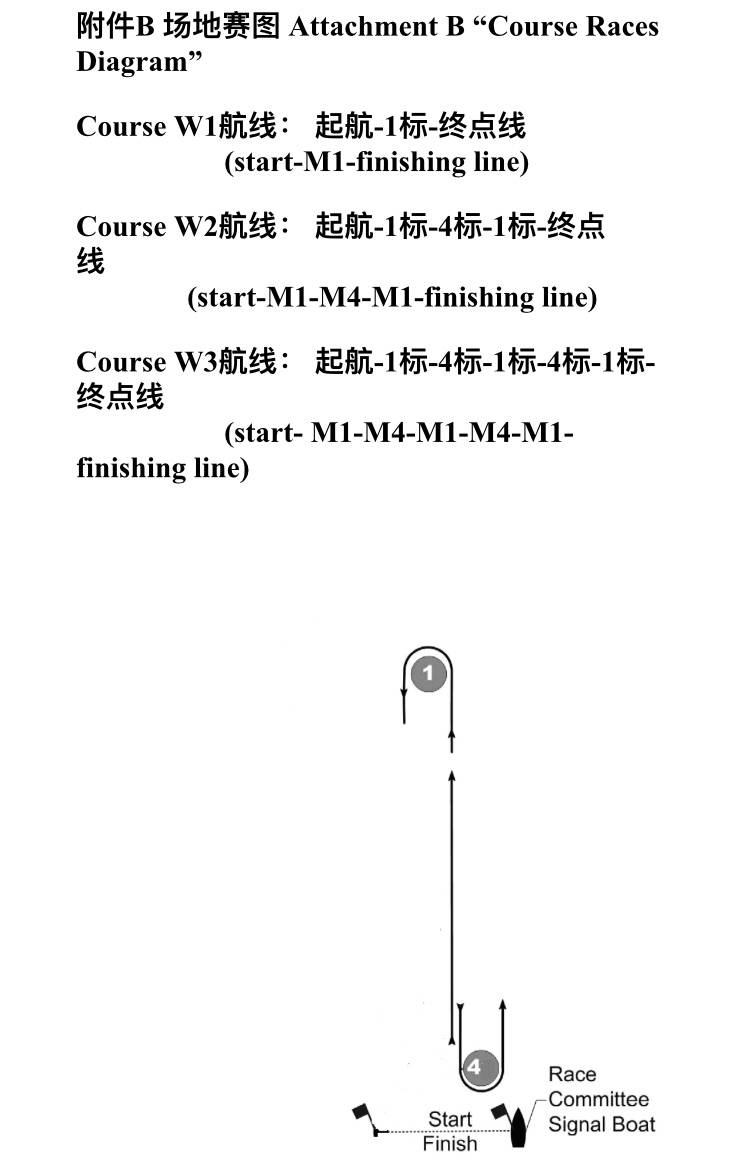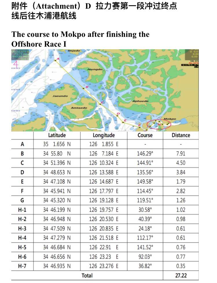 5.2为提示船只比赛或相连比赛将很快开始,至少在发出预告信号前5分钟将展示一面橙色旗并伴随一声音响 5.3计划在青岛和木浦各举行3轮场地赛,总计6轮场地赛。9月17日和23日当天15:00之后将不再发出场地赛预告信号。 6、级别旗 远东杯赛事旗(白底黑色文字) 7、场地赛竞赛水域 中国青岛奥帆中心附近水域-韩国木浦,参见附件A。 8、航线 8.1场地赛为迎尾风场地,航线(见SI附件B)比赛均是左舷绕标。 8.2场地赛时竞赛委员会将在预告信号发出之前,在起航船白板上写出1标的罗盘方位和将要行驶的航线。(通过VHF公告) 8.3拉力赛预告信号之前,当起点信号船上展示绿三角旗时,所有的帆船需右舷绕过一标,之后,继续向下一航段行驶。 8.4拉力赛时,各参赛船只起航后,在通过组委会设立的每一个航点的经度线时,应对通过时的经纬度坐标点及手持GPS时间进行拍照并在纸上自行记录通过时间。到岸后应向竞赛委员会提交通过每一个航点经度线详细时间的纸质记录并将照片上传官方微信群。各船通过每一航点经度线和从航线那侧通过终点线(门标)的照片(有详细的经纬度坐标和GPS时间)必须足够清晰以至于竞委会可以轻松读出相关数据。如果竞委会宣布缩短一个赛段的比赛,以80%的帆船通过的最近的一个航点经度线,记录该赛段的比赛成绩。 No.1航点36°02.000’N120°37.000’E No.2航点35°50.000’N121°35.000’E No.3航点35°40.000’N122°25.000’E No.4航点35°30.000’N123°10.000’E No.5航点35°20.000’N124°00.000’E No.6航点35°10.000’N124°45.000’E 终点线 (门标):34°58.000’N125°50.000’E 34°57.000’N125°50.000’E 8.5参加拉力赛的帆船需要保留船上GPS航迹备查。 8.6拉力赛期间,竞赛委员会根据RRS32中所提到的原因可能会缩短或放弃比赛。竞赛委员会将通过72或卫星电话通知船队。 8.7所有GPS时间设定为北京时间(避免混乱)。 9、标志 9.1场地赛标识为约1.2米高的橙色圓柱形充气浮标。 9.2起、终点标分别为升起橙色信号旗的RC船及其左侧的浮标。 9.3起点线和终点线的左侧标将是一个橙色三角形充气浮标。 10.障碍物 场地赛(36°3.251’N,120°22.777’E为暗礁)和拉力赛竞赛区域有渔网。请注意瞭望规避。 11、起航 11.1起航线为起航船上橙色“START”旗旗杆和起航标之间的连线。 11.2进入起航程序时,其教练艇应避开起航区域。 11.3起航信号发出4分钟后仍未起航的参赛船只将被记录为未起航(DNS),此记分不必通过审理。拉力赛时,该时间将是起航信号发出后2小时内起航,除非竞赛委员会同意一条船晚起航。本条细则更改了竞赛规则A4。 11.4竞赛委员会将在起航信号发出后,将会尝试通过VHF77频道上播报违反起航规则的帆号或船首号。未能播报或未能按时播报不能成为要求补偿的理由。本条更改规则62.1(a)。 11.5木浦至青岛的拉力赛起航方式根据木浦外侧水域情况待定。 12、下一航段的改变 12.1删除规则33 (a) (2)和(b)。如果改变下一段航线,竞赛委员会(RC)将移动原有的标志(或终点线)到新的位置。 12.2参赛船应在发出改变下一段航线信号的竞委会船和附近的浮标之间通过。左舷一侧离开浮标,右舷一侧离开竞委会船。本条更改规则28.1 13、终点 13.1场地赛终点线为展示蓝旗的竞赛委员会船(RC)上的橙色旗旗杆和另一侧浮标之间的连线。起航线也是终点线。 13.2拉力赛竞赛委员会出于成绩发布时间以及后续赛事的延续等因素的考虑,对于居后船队可以酌情给予终航时间,船队在接到通知后,可以直接驶往港口。此条修改RRS35和RRSA4.1. 14、惩罚方法 根据规则44.1的判罚,两圈更改为自转一圈,包括1个迎风换舷和1个顺风换舷。 15、时间限制和目标时间 15.1场地赛时间限制和目标时间见下表: