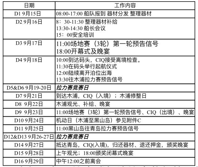 比赛时间:2017年9月15日—9月29日 主办单位:青岛市重大国际帆船赛事(节庆)活动组委会、青岛市体育局、青岛奥帆城市发展促进会、青岛市帆船帆板(艇)运动协会、青岛旅游集团有限公司、青岛市帆船运动管理中心 承办单位:青岛丝绸之路航海赛事管理有限公司、韩国木浦市帆船协会、韩国世翰大学。 1、规则 1.12017-2020年国际帆船竞赛规则(RRS)所定义的规则; 1.2国际帆联 (ISAF)3级离岸赛条例(OSR) 1.3自日落至日出时执行国际海上避碰规定(IRPCAS),并替代RRS第二章。 1.4本赛事的竞赛通知(NOR)及其补充通知; 1.5本赛事的航行细则(SI)及其之后的更改; 1.6国家机构管理规定不适用。 1.7如果RRS有歧义时以英文版为主。 2、参赛选手通知 2.1参赛者通知将张贴在竞赛委员会设立的官方公告栏上。 2.2如有可能,下水码头附近将设临时公告栏。 2.3竞赛委员会通过微信通告公告栏内的所有内容,各队在技术会时可添加竞赛委员会的微信平台号码,但所有的竞赛通知以官方公告栏为准。 3、航行细则的更改 3.1航行细则的更改将于生效的当天起航预告信号之前90分钟公告。 3.2在特殊情况下,如有必要在水上对航行细则进行更改,在起航预告信号前10分钟在竞赛委员会信号船上升起国际代码“L”旗并伴随一声音响,同时通过对讲机向参赛帆船公告航行细则的更改内容。请各参赛船队注意守听VHF77. 3.3竞赛日程的变化,将在其生效的前一天21:00之前公告。 4、岸上信号 4.1岸上信号将展示在官方信号旗杆上。 4.2岸上展示AP旗,竞赛信号AP规定中的“1分钟”被“不少于40分钟”代替。 4.3岸上展示Y旗时,在水上整个过程规则40适用。此处更改了规则第四部分前言。 5、竞赛日程安排 5.1竞赛日程如下:2017年7月16日通过邮件和或微信来进行船只抽签。