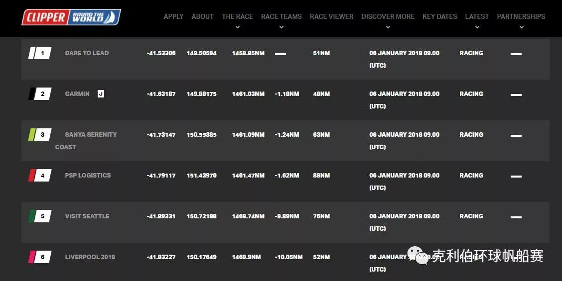 由澳洲船长Wendy Tuck率领的‘三亚新奇世界半山半岛号’赛队在本文撰稿时暂列第一,报告中说到:“过去24小时的航行较为艰难,一直是逆风,这种状况通常是在悉尼霍巴特帆船赛中常见的。”