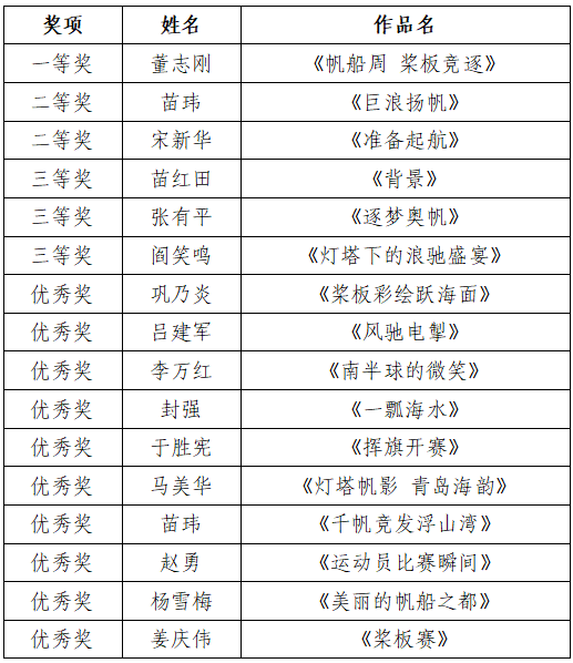 其中,董志刚作品《帆船周桨板竞逐》荣获一等奖,苗玮作品《巨浪扬帆》、宋新华作品《准备起航》荣获二等奖,苗红田作品《背景》、张有平作品《逐梦奥帆》、阎笑鸣作品《灯塔下的浪驰盛宴》荣获三等奖,巩乃炎作品《桨板彩绘跃海面》、吕建军作品《风驰电掣》、李万红作品《南半球的微笑》、封强作品《一瓢海水》、于胜宪作品《挥旗开赛》、马美华作品《灯塔帆影青岛海韵》、苗玮作品《千帆竞发浮山湾》、赵勇作品《运动员比赛瞬间》、杨雪梅作品《美丽的帆船之都》、姜庆伟作品《桨板赛》荣获优秀奖。